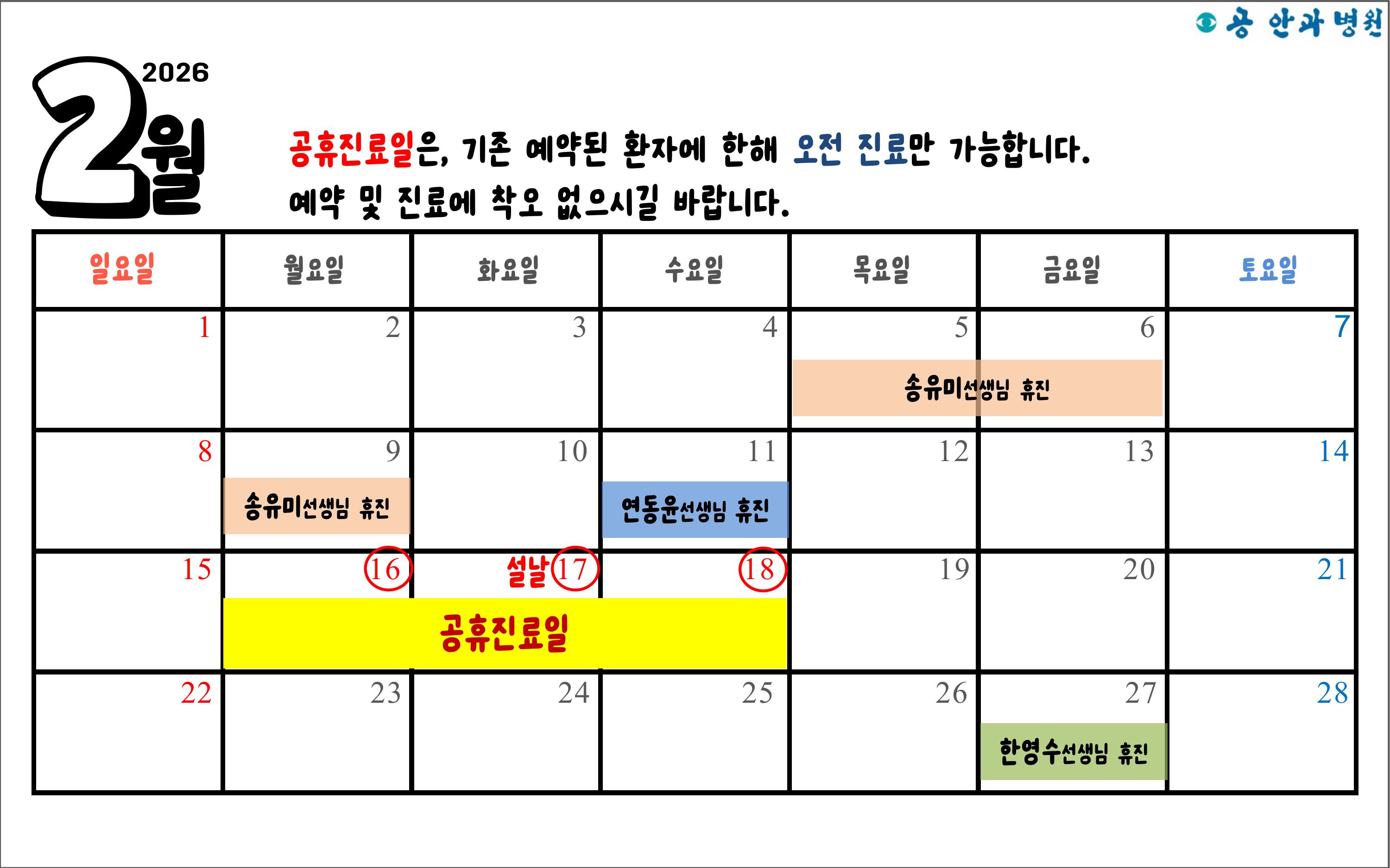 2026년 2월 공안과병원 휴진 및 공휴진료일 안내