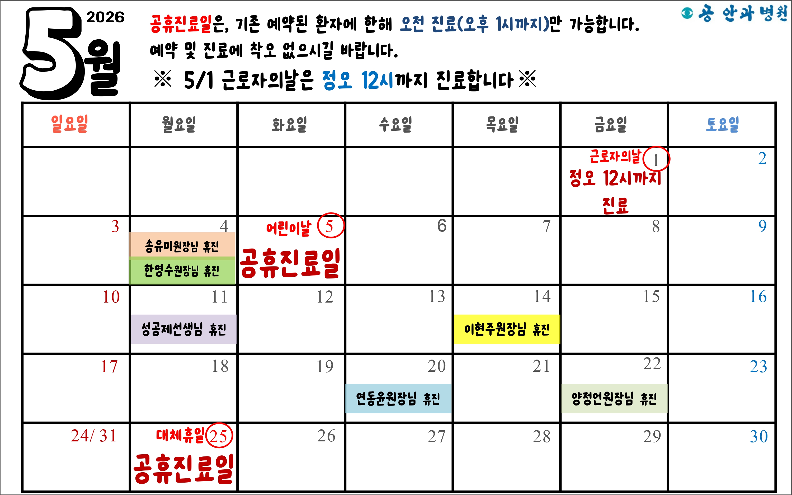 2026년 5월 공안과병원 휴진 및 공휴진료일 안내