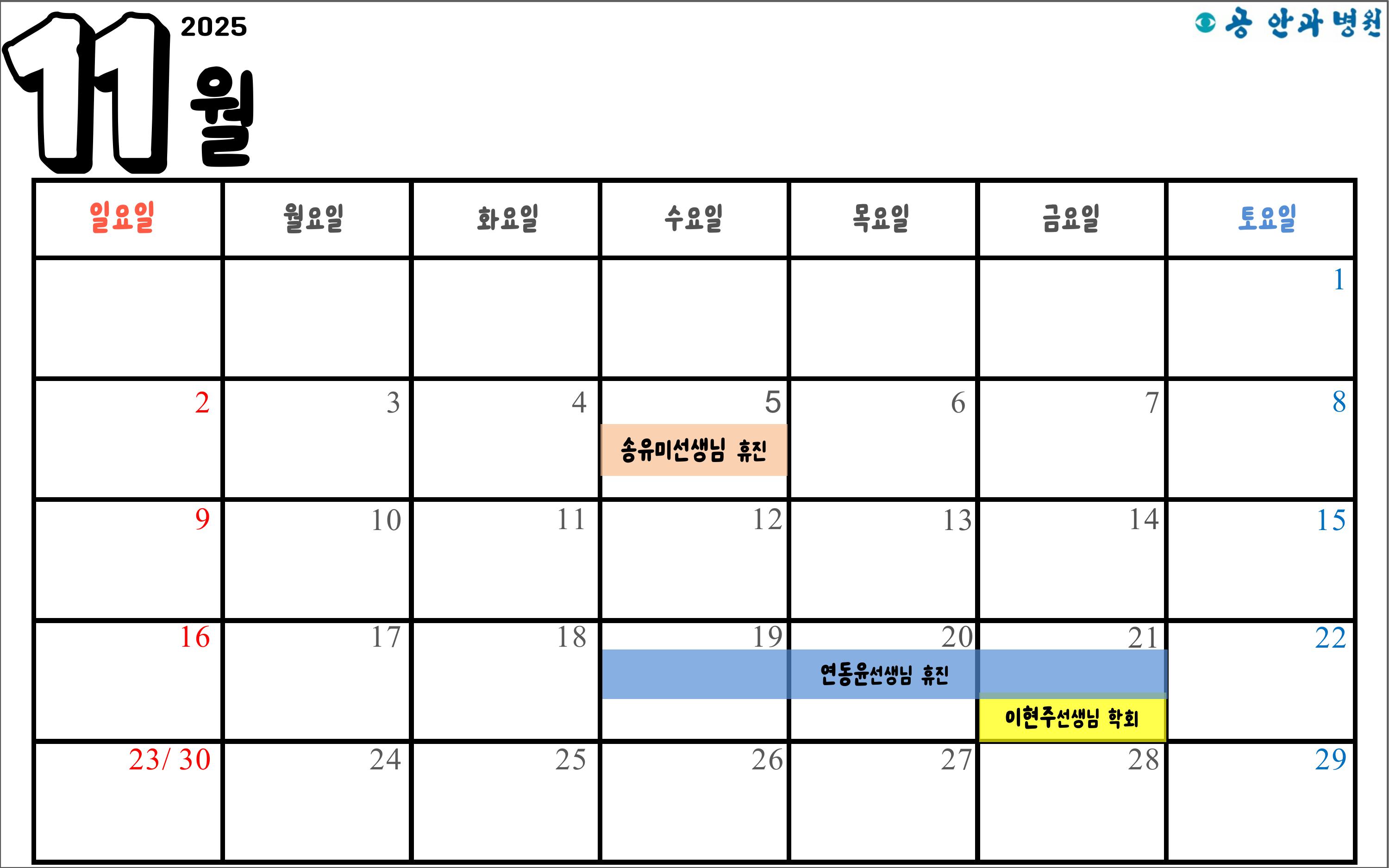 2025년 11월 공안과병원 휴진 및 공휴진료일 안내