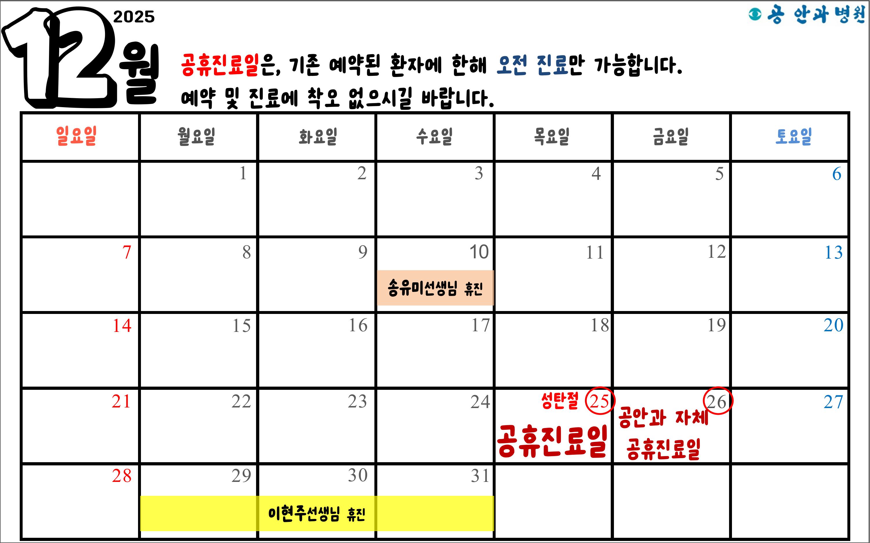 2025년 12월 공안과병원 휴진 및 공휴진료일 안내
