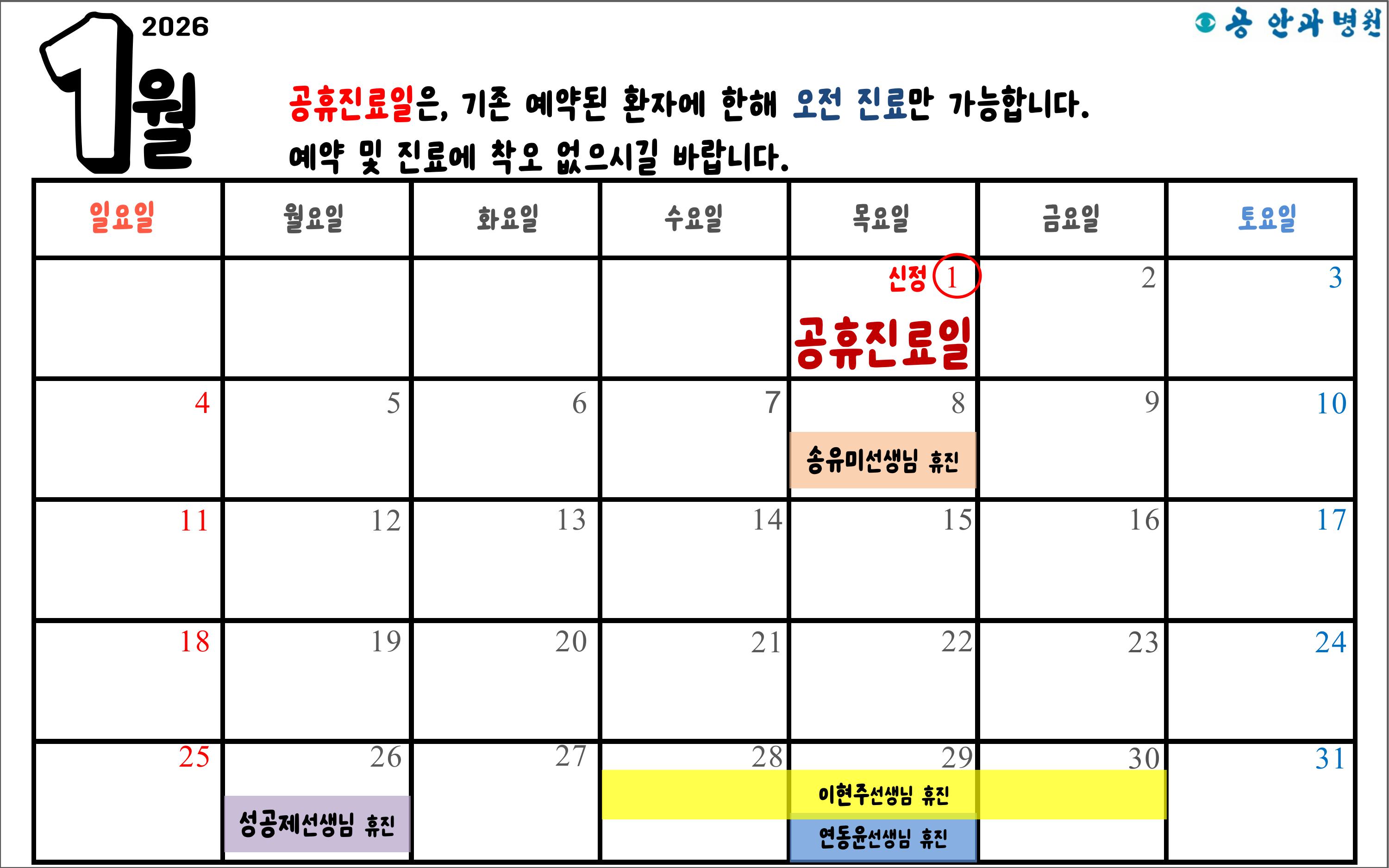 2026년 1월 공안과병원 휴진 및 공휴진료일 안내