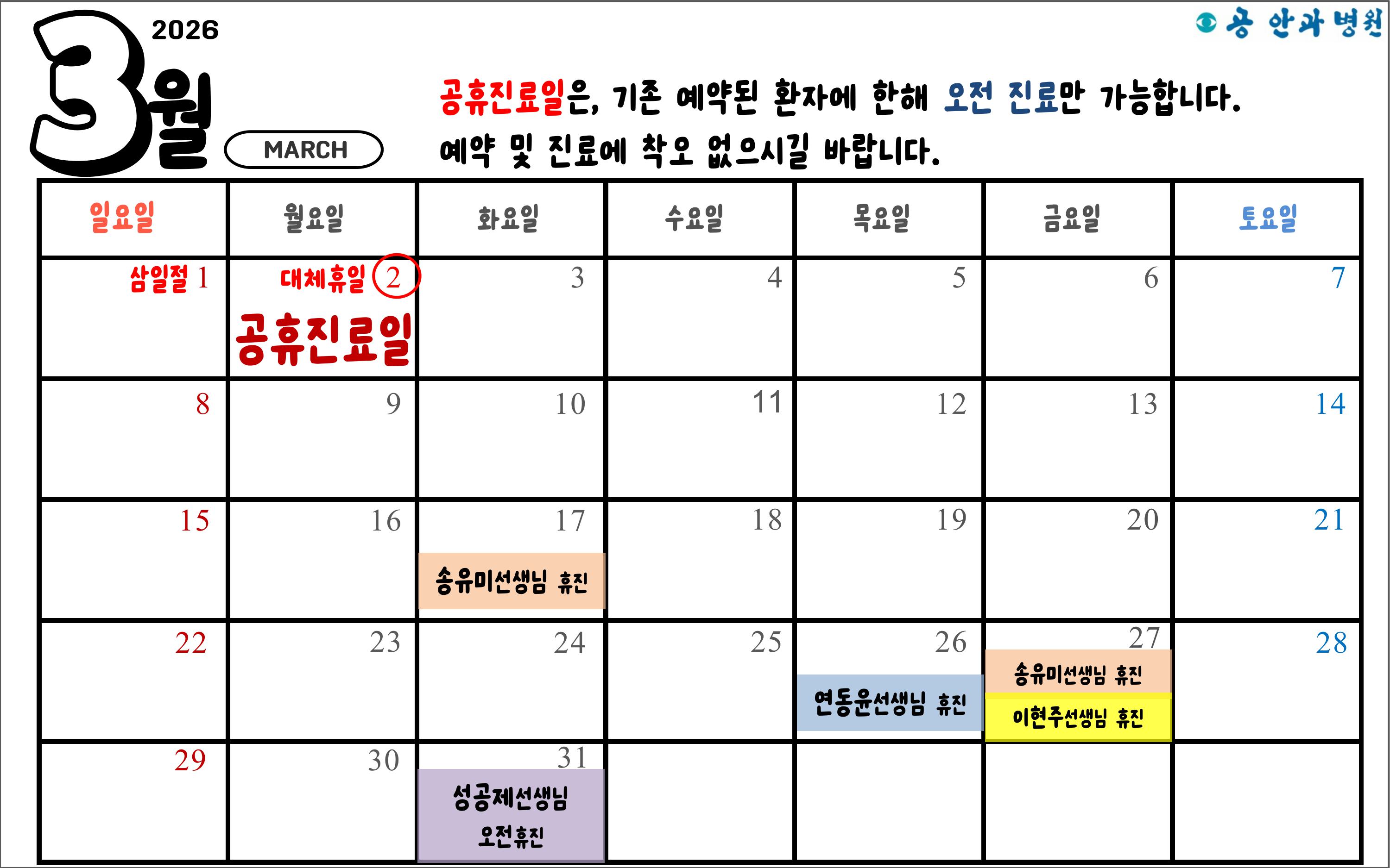 2026년 3월 공안과병원 휴진 및 공휴진료일 안내